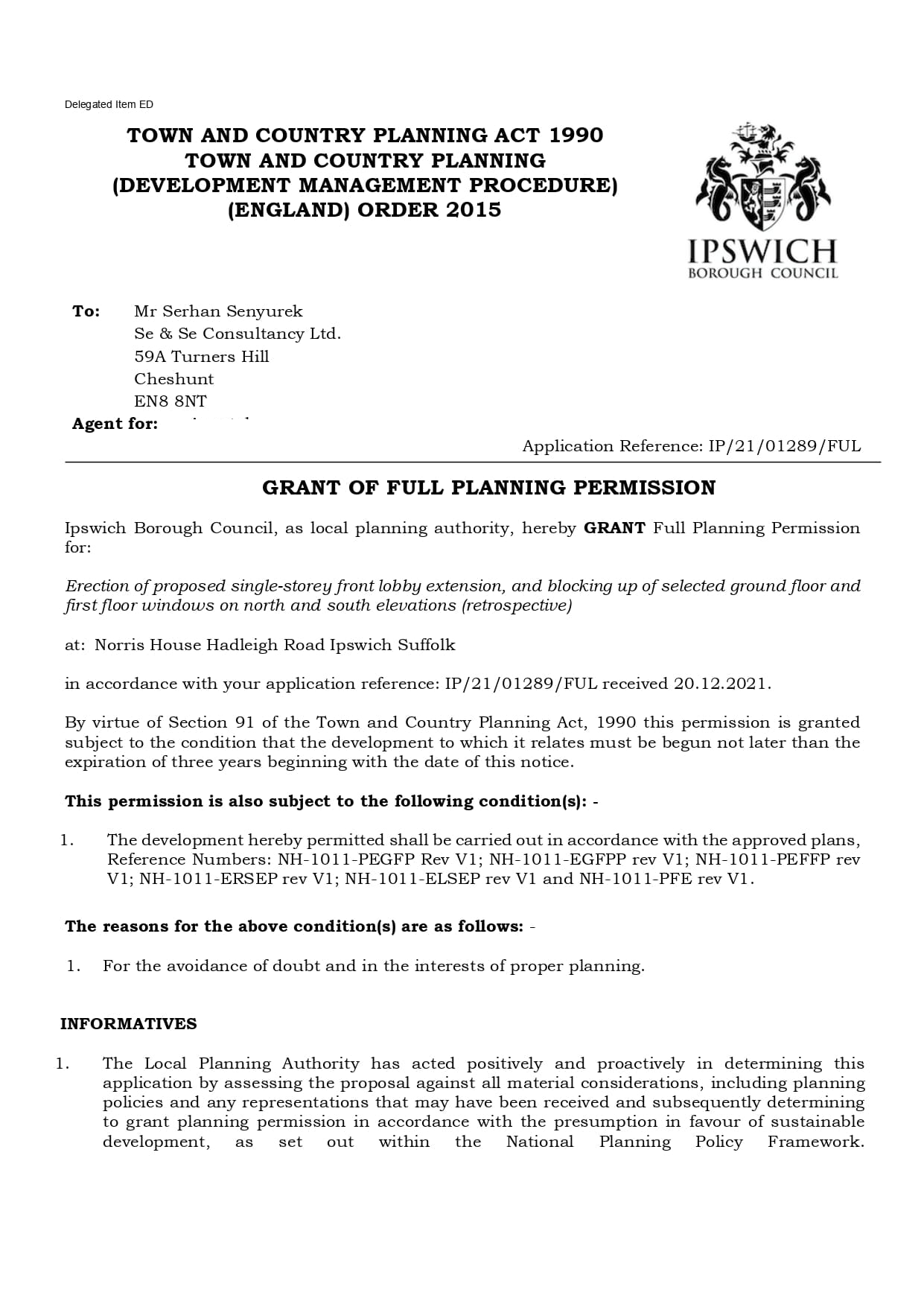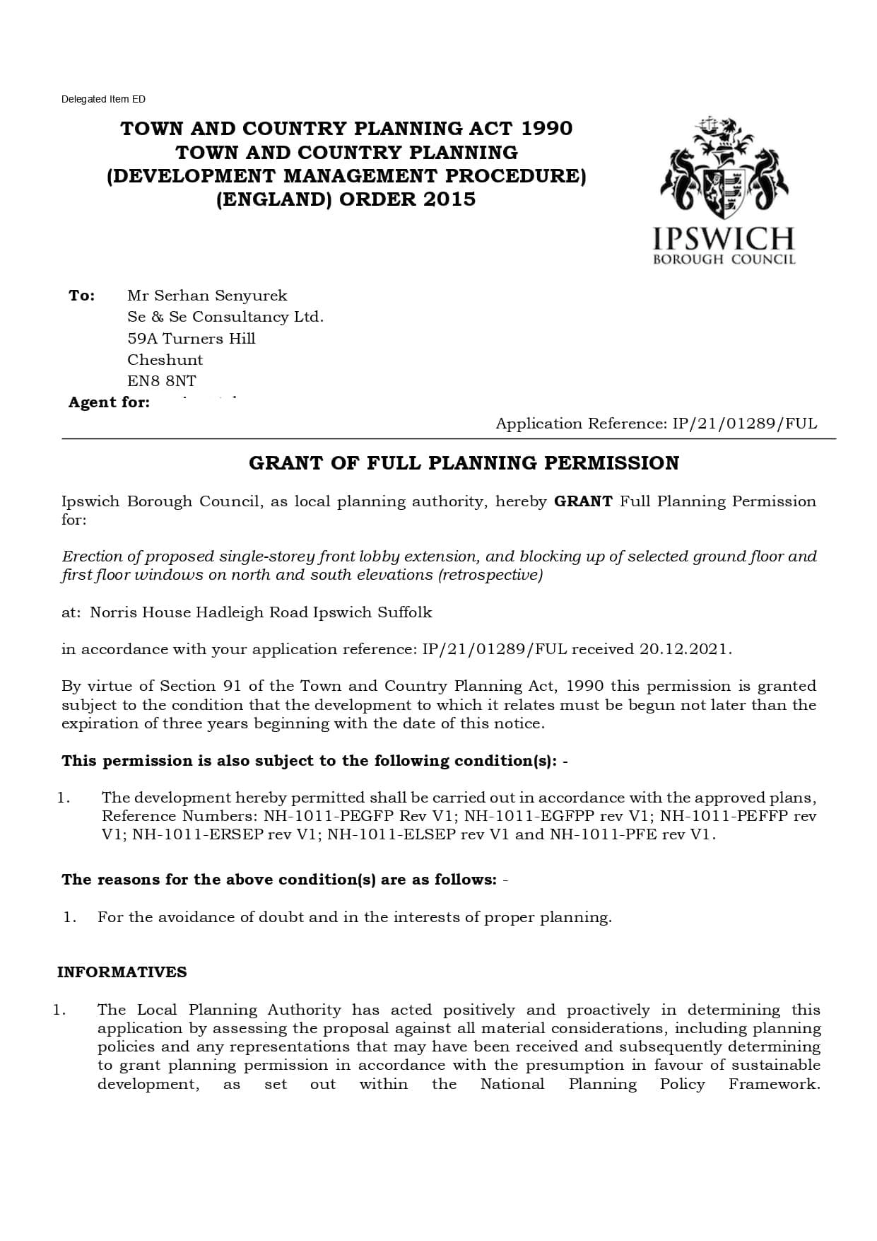 We successfully secured full planning permission for a single-storey front lobby extension and the retrospective blocking up of selected windows at Norris House, Hadleigh Road, Ipswich. The application was approved by Ipswich Borough Council following a thorough review of the proposed works in line with local and national planning policies.